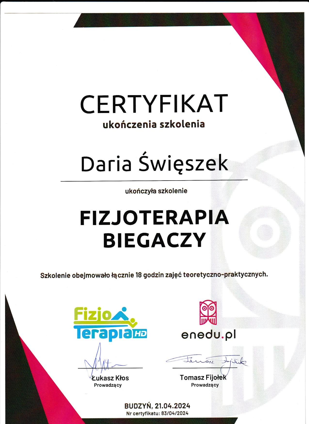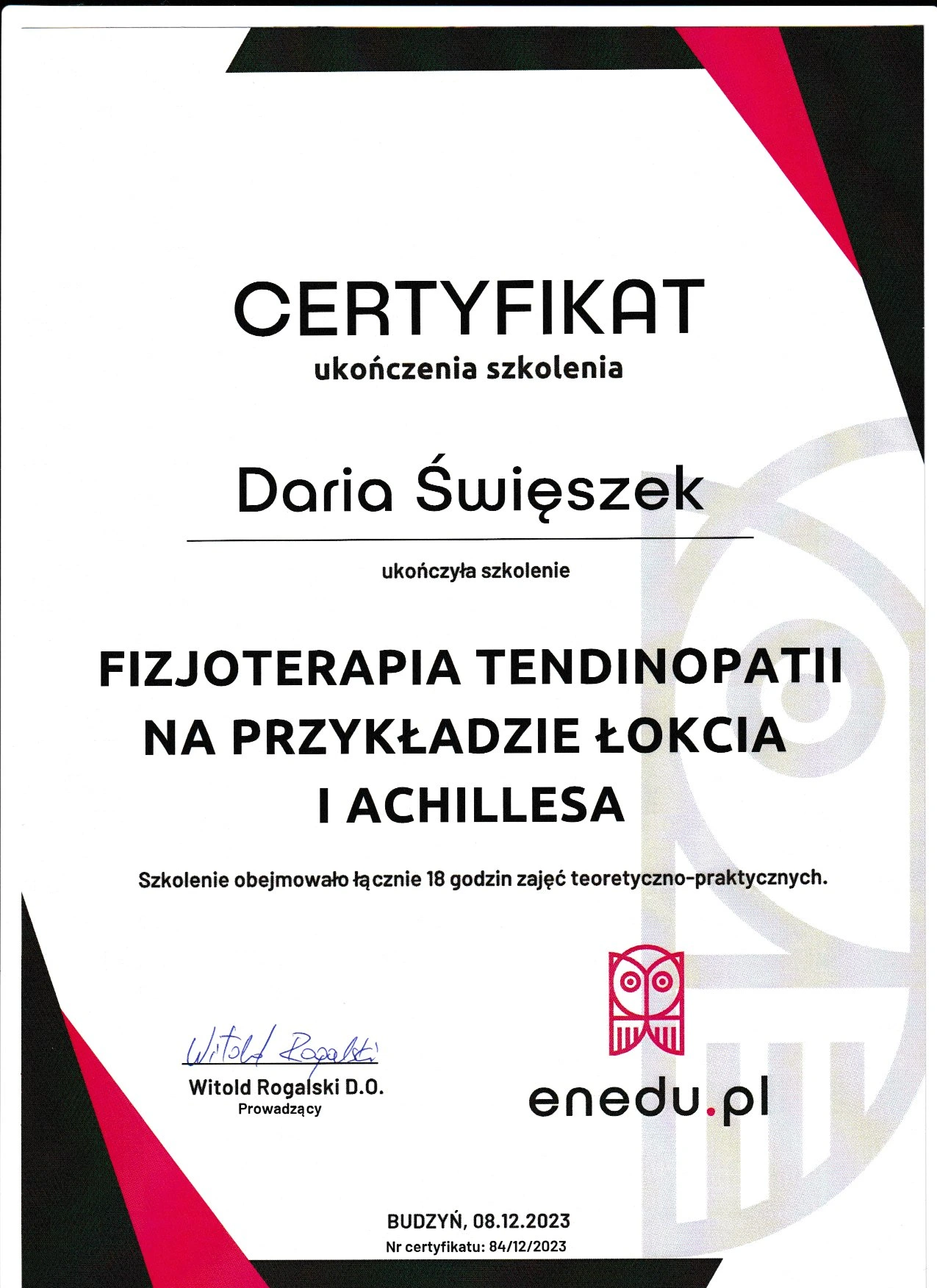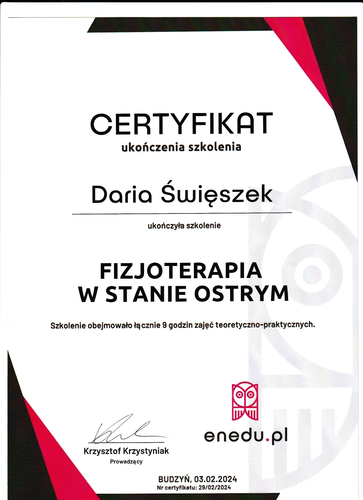 - ukończenie 2 modułowego, 100h szkolenia Proprioceptive Neuromuscular Facilitation PNF