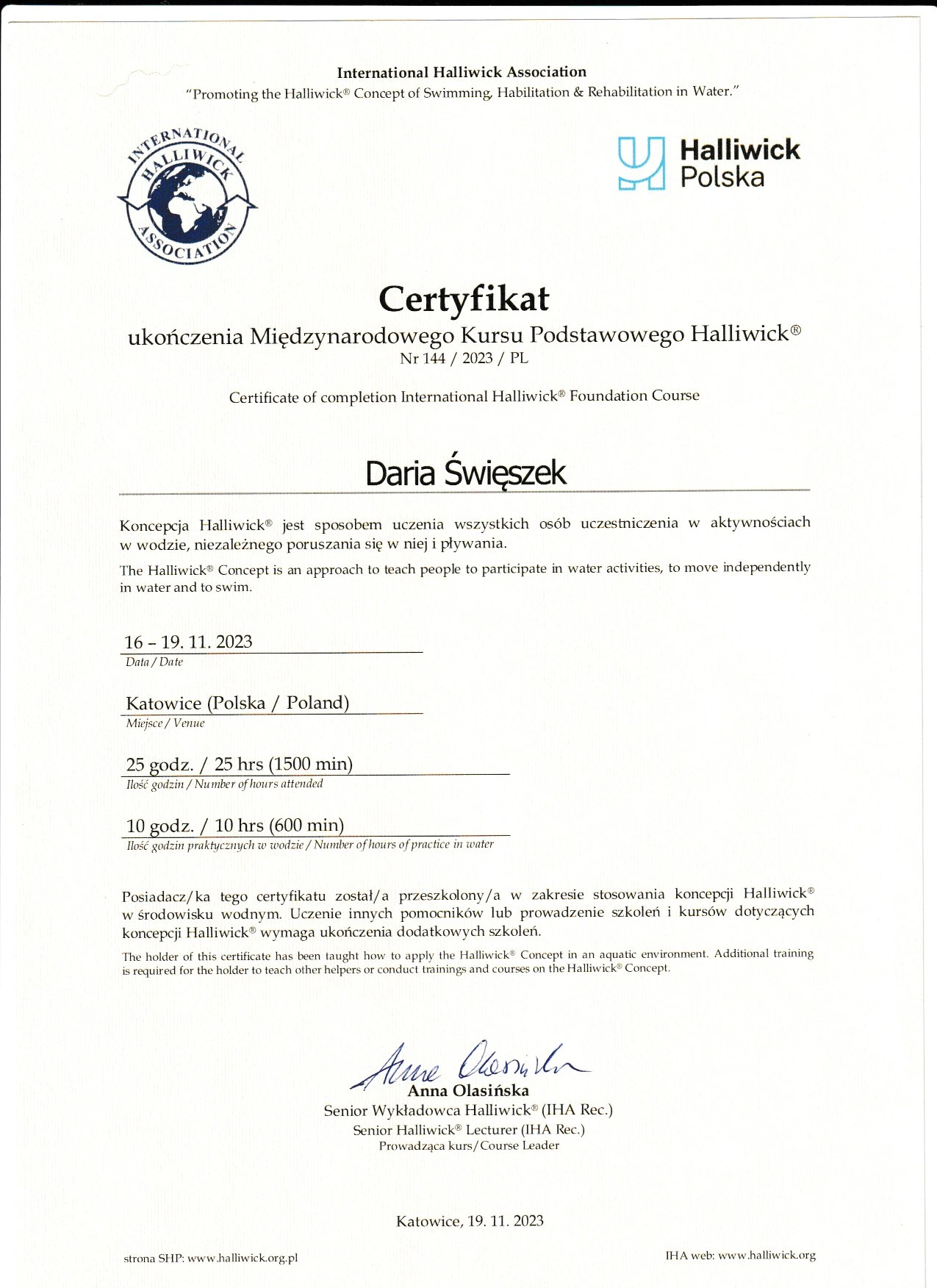 - Międzynarodowego Kursu Podstawowego Halliwick