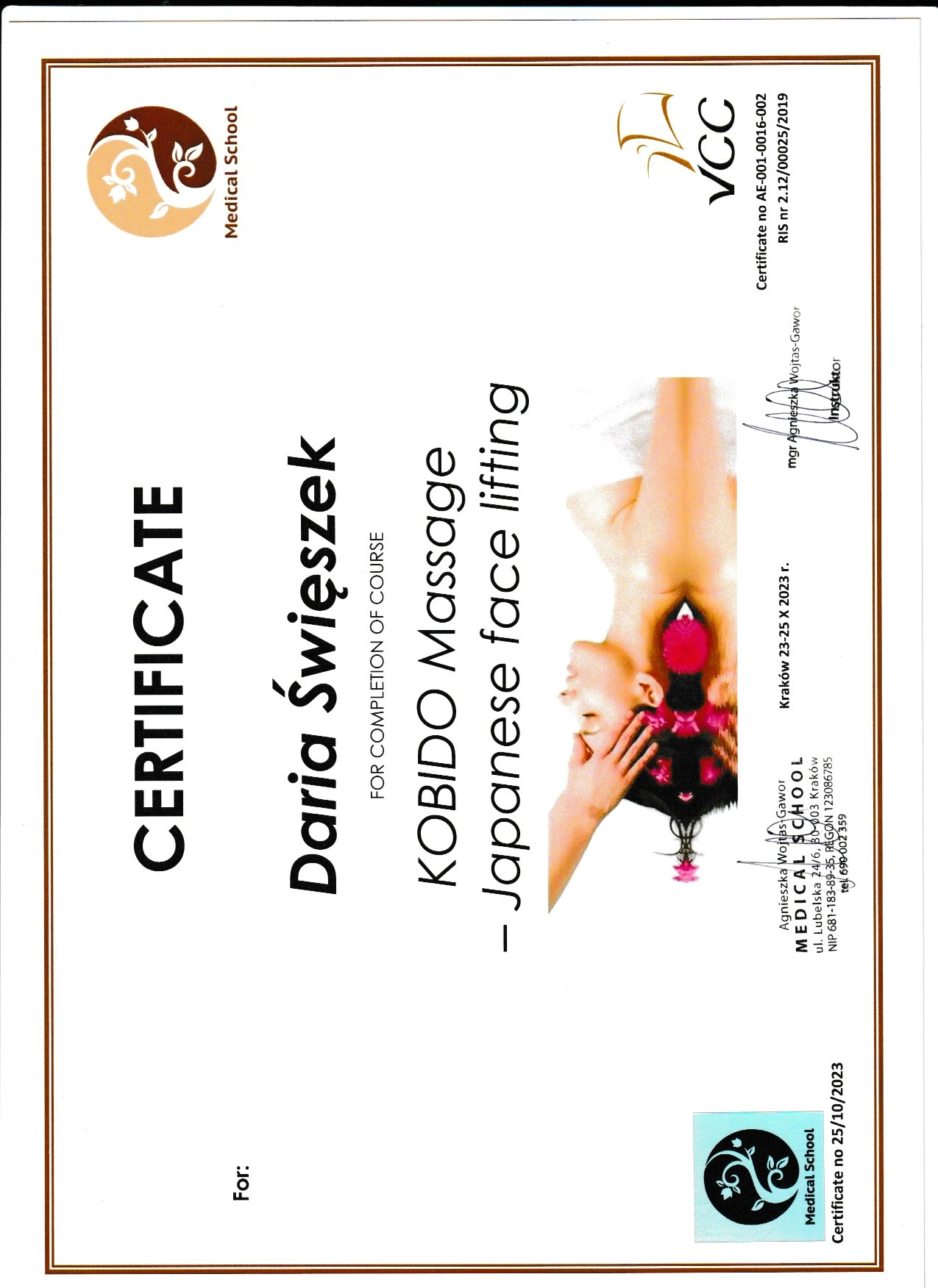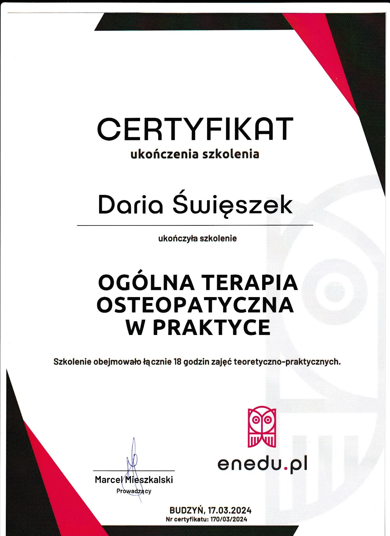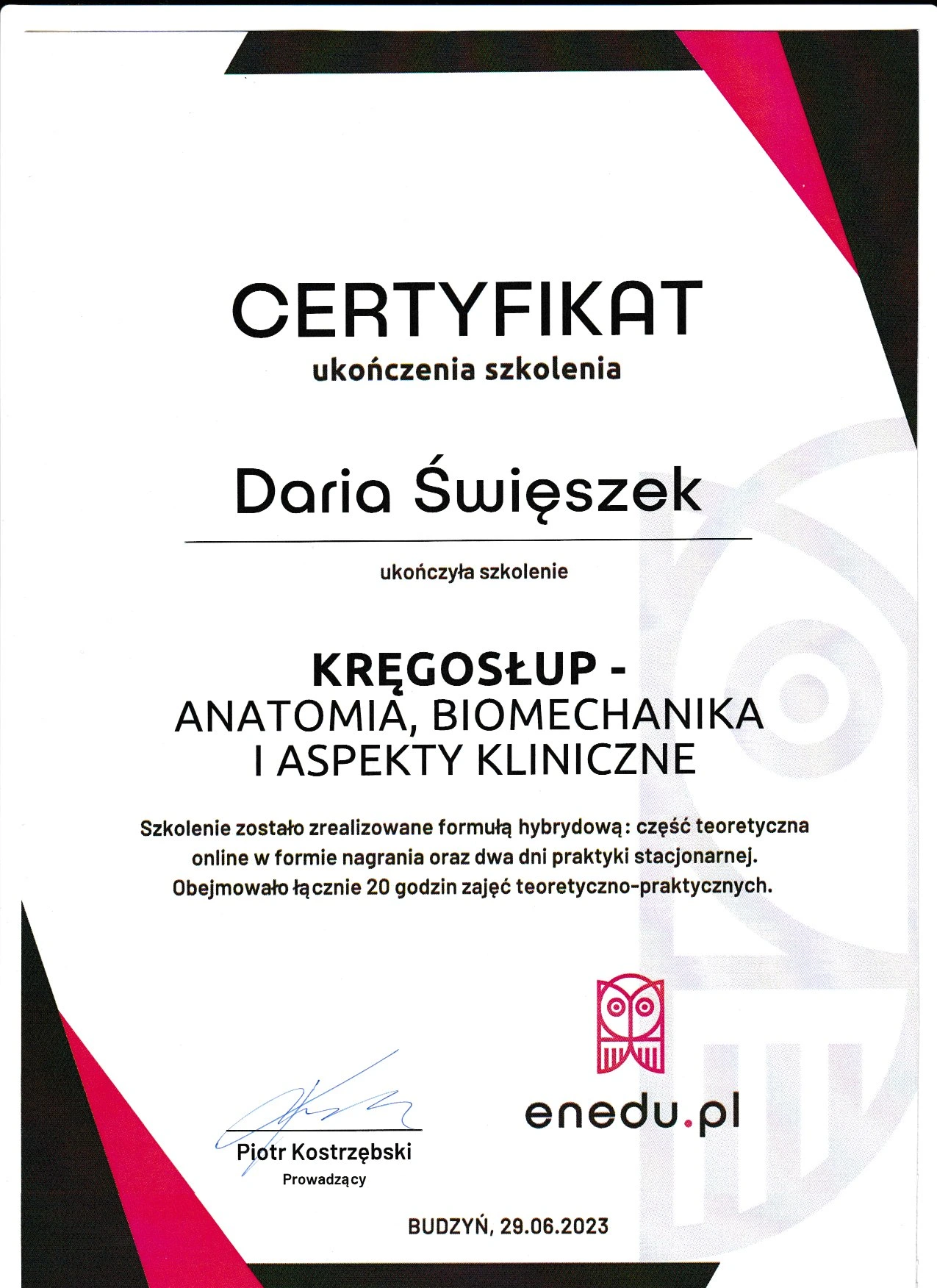 - ukończenie 3 modułowego kursu stabilizacji – (Prowadzący: Instruktor MT e.V. IFK, PT/OMT Stanisław Legocki) - ukończenie warsztatów Kinetic Control